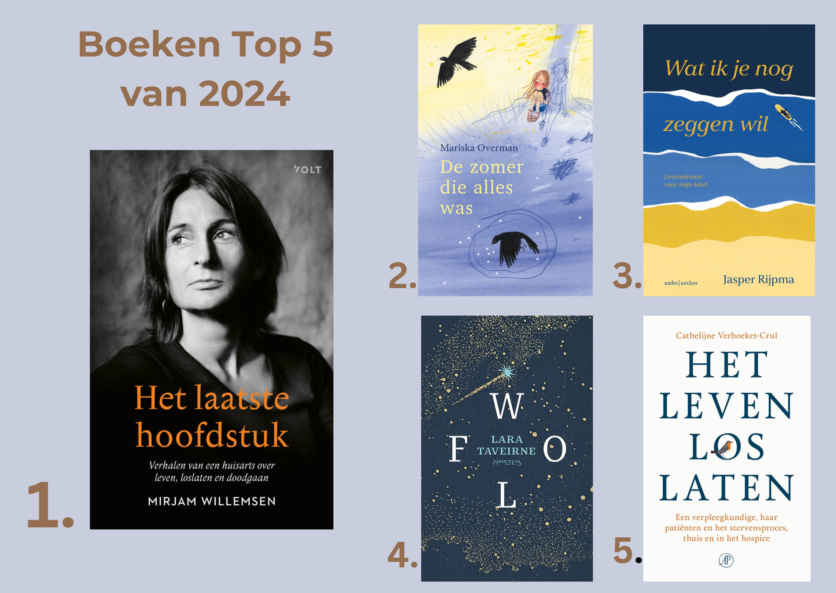 In 2024 las ik menig boek over palliatieve zorg, levenseinde, hospicezorg, ongeneeslijk ziek-zijn, dood, rouw en aanverwante thema’s. Ik stelde er onderstaande top vijf uit samen.